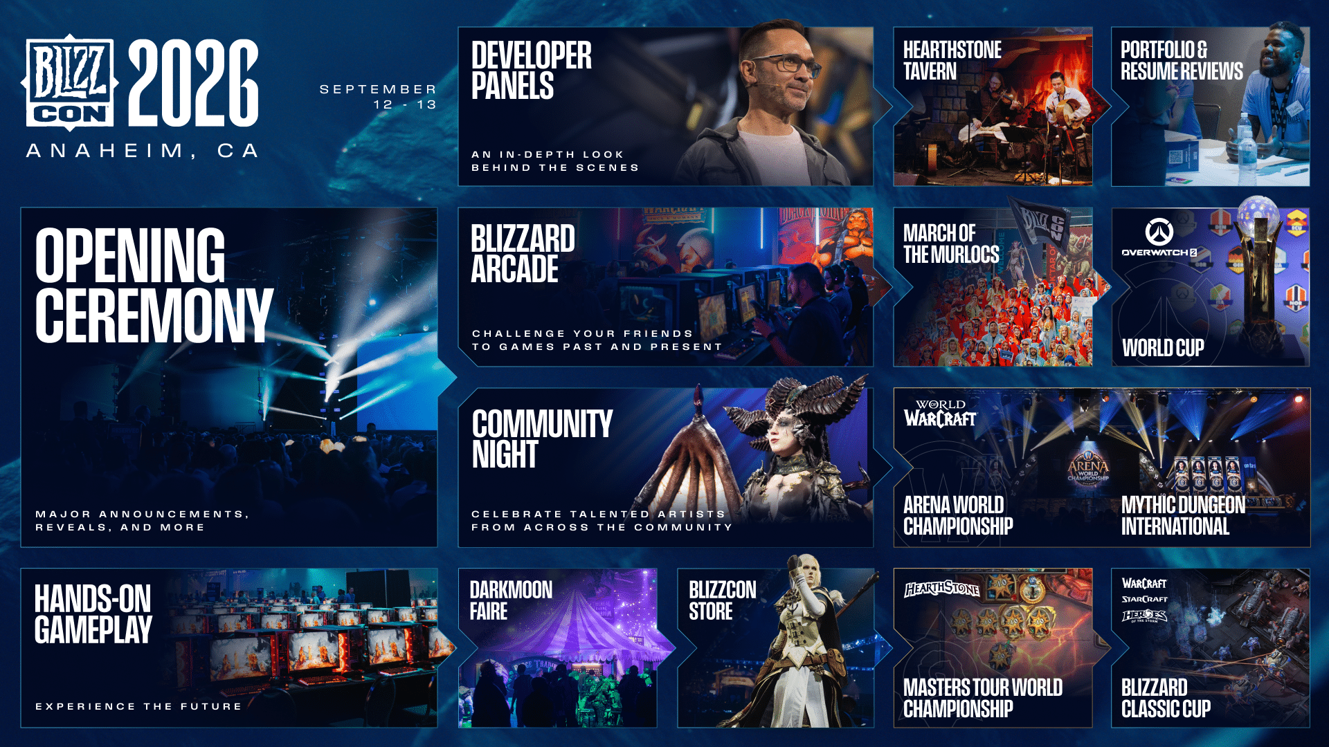 • Das BlizzCon 2026 wird elfte eSport-Wettbewerbe über vier Spiele präsentieren: Heroes of the Storm, StarCraft: Remastered, StarCraft II und Warcraft III: Reforged, mit dem Höhepunkt im Blizzard Classic Cup.